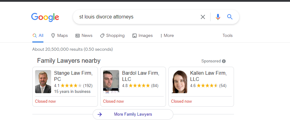 有人輸入了對當地律師事務所的查詢,搜索結果的頂部會顯示廣告。