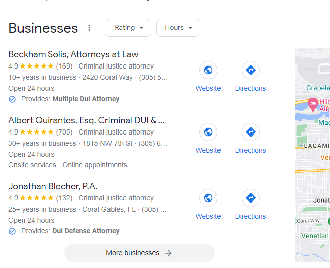 它展示了邁阿密的酒駕律師名單,旁邊是一張地圖。這應該是一個目標,因為它包括您的網站鏈接、營業時間、電話號碼和路線——非常適合將潛在客戶直接引導到您的辦公室。