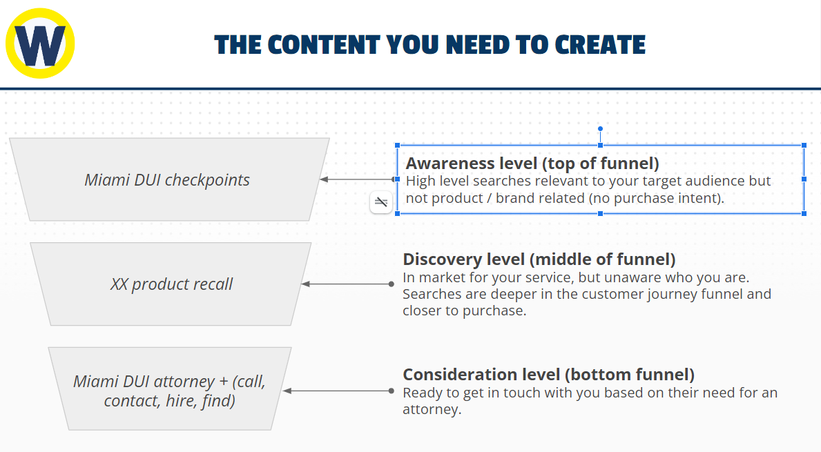 漏斗頂部的訪問者不知道他們有法律問題。因此,這些從一開始就最不可能轉換。他們進行與您的律師事務所或服務無關的高級搜索。所以他們現在不是在尋找律師。