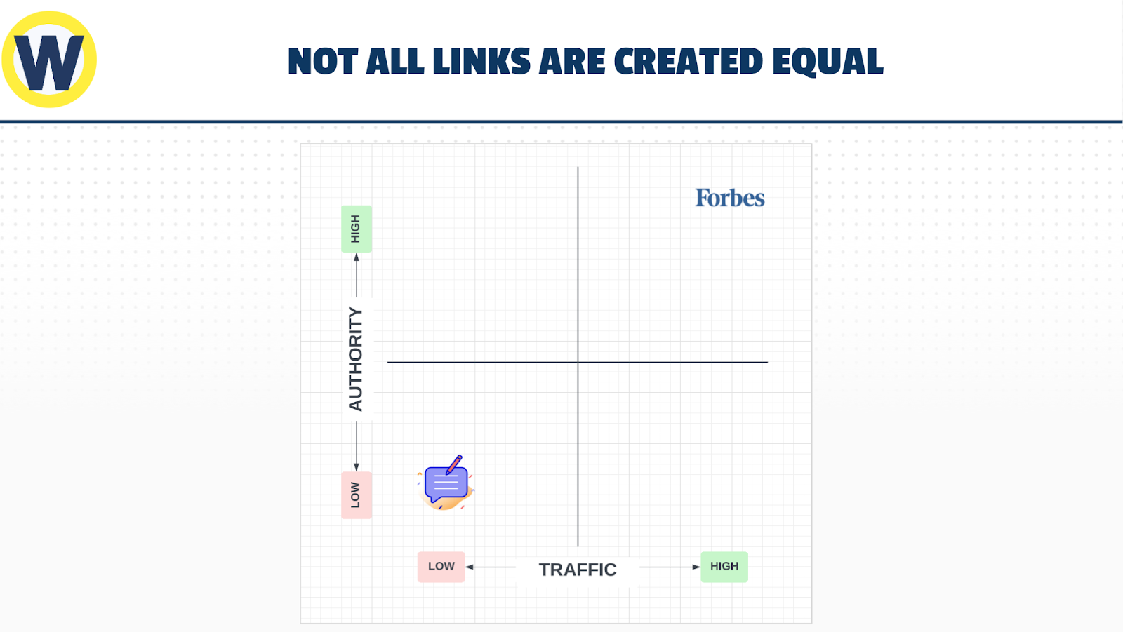 在圖表中,左下象限中的站點來自低權限和低流量(不是合適的反向鏈接)。然后在右上象限,你有高流量和權威的福布斯(最好的鏈接)。